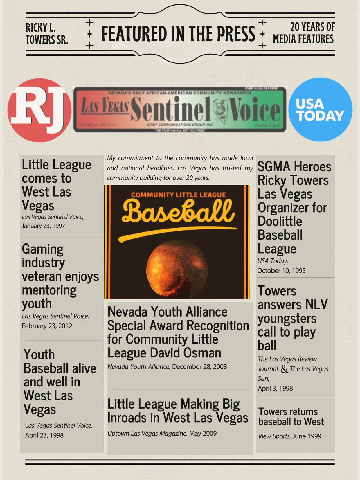 Not only is Ricky L. Towers Sr. known as "Las Vegas Ricky", he has been a driving force for change in the Las Vegas community for more than 40 years. He is the founder of Towers Sports & Marketing supporting a safe and nurturing environment for Las Vegas youth especially in the realm of Little League Baseball. Ricky is still supporting opportunities to create more exposure for youth in the area of sports.